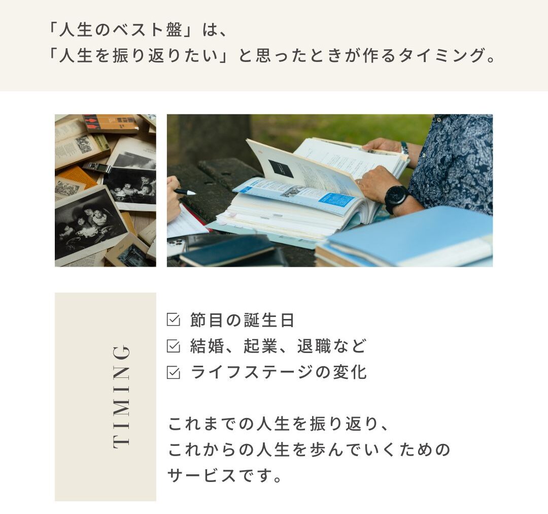 「人生のベスト盤」は、「これからの人生を歩むために、これまでのことを振り返りたい」「これまでの自分の人生を残しておきたい」と思ったときが作るタイミング。